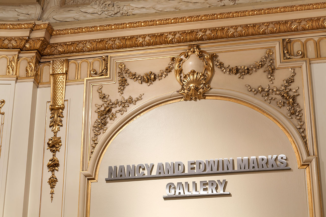 The signage and environmental graphics articulate the identity throughout the mansion, helping to establish the unique institutional personality and sense of place in the historic interior. Large-scale numbers identify the floors in the contemporary staircase that connects the different levels of the museum. At the new 90th Street entrance, the canopy designed by Diller Scofidio + Renfro features an extruded version of the wordmark passes through the landmarked fence without touching it. In the galleries, donor names float in front of walls and are cut from stainless steel, a modern counterpart to the mansion's Gilded-Age elegance.