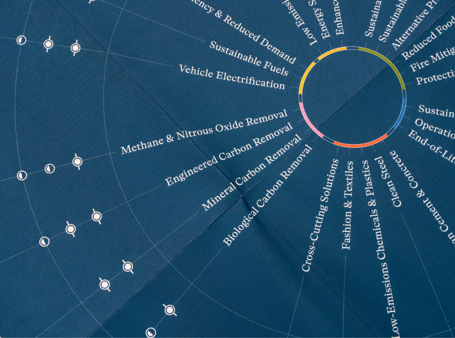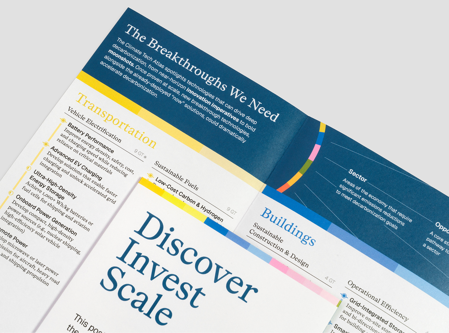 The front door to the web experience is the “wheel:” a colorful array of six sectors, divided into twenty-four Opportunity Areas, each featuring simple icons representing their respective “Innovation Imperatives” and “Moonshots.” The wheel evokes a star chart, the rays of the sun, and a spotlight that guides users to areas of interest. Each of the twenty-five rich landing pages feature custom infographics, context for each opportunity, educational videos, and deeper information about the related Innovation Imperatives and Moonshots. An additional section of the site dives into the 100 categories of technologies that will be part of the energy transition.