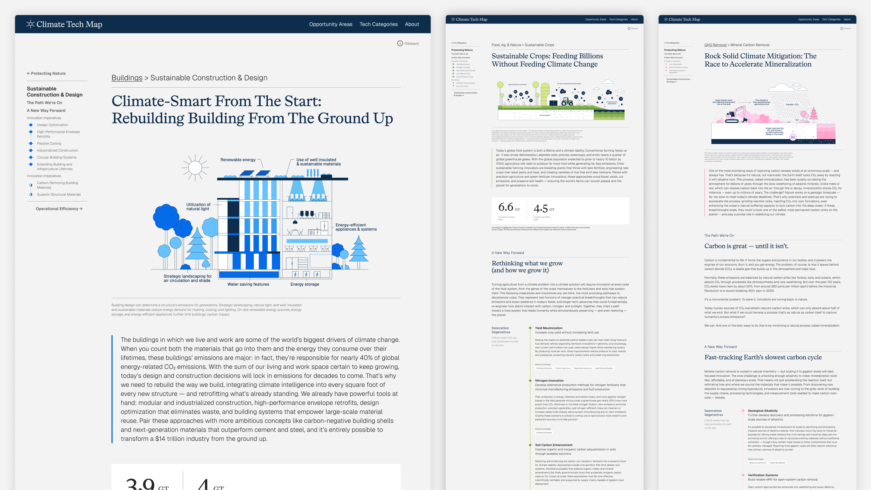 As with any complex data or content challenge, the first step for Lupi and her team was to understand the structure and shape of the content, and the organizational and audience goals. What data do we have and where are the gaps? What innovations have the greatest potential to reduce greenhouse gasses? What are the areas of opportunity in each sector? Who are we trying to engage the most? Lupi’s team started with a robust discovery, information architecture, and content strategy phase, which led to deeper understanding of the available content and a conceptual framework that could bring it to life.