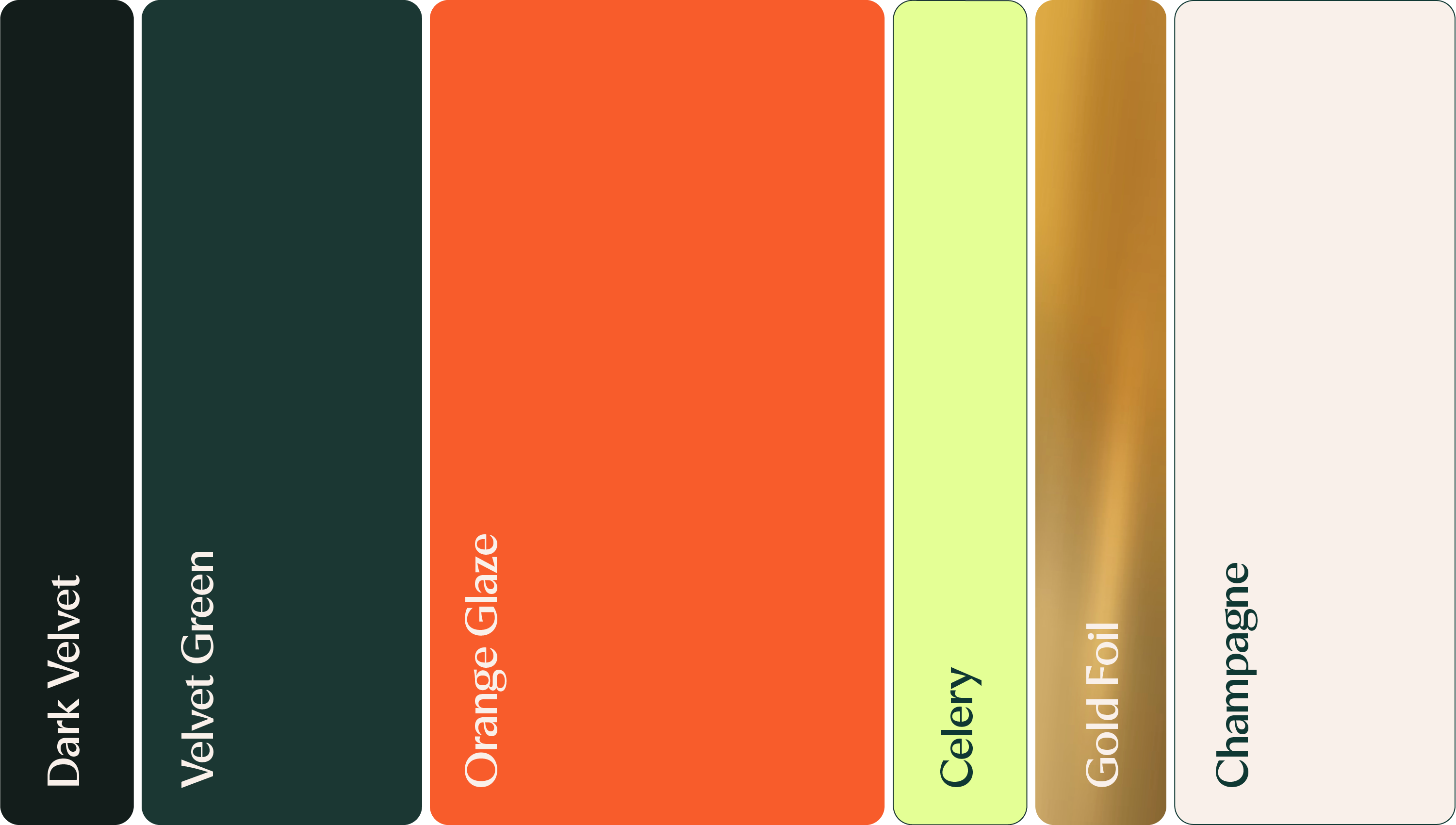 The menu and interiors inspired a vibrant brand palette with appetizing colors like orange glaze, celery, Champagne and velvet green. The golden fried chicken is reflected in gold foil accents. These elegant hues are offset by the bright orange of boutique-ready takeout bags and boxes, whose rounded corners reference the logo and help the packaging feel special.