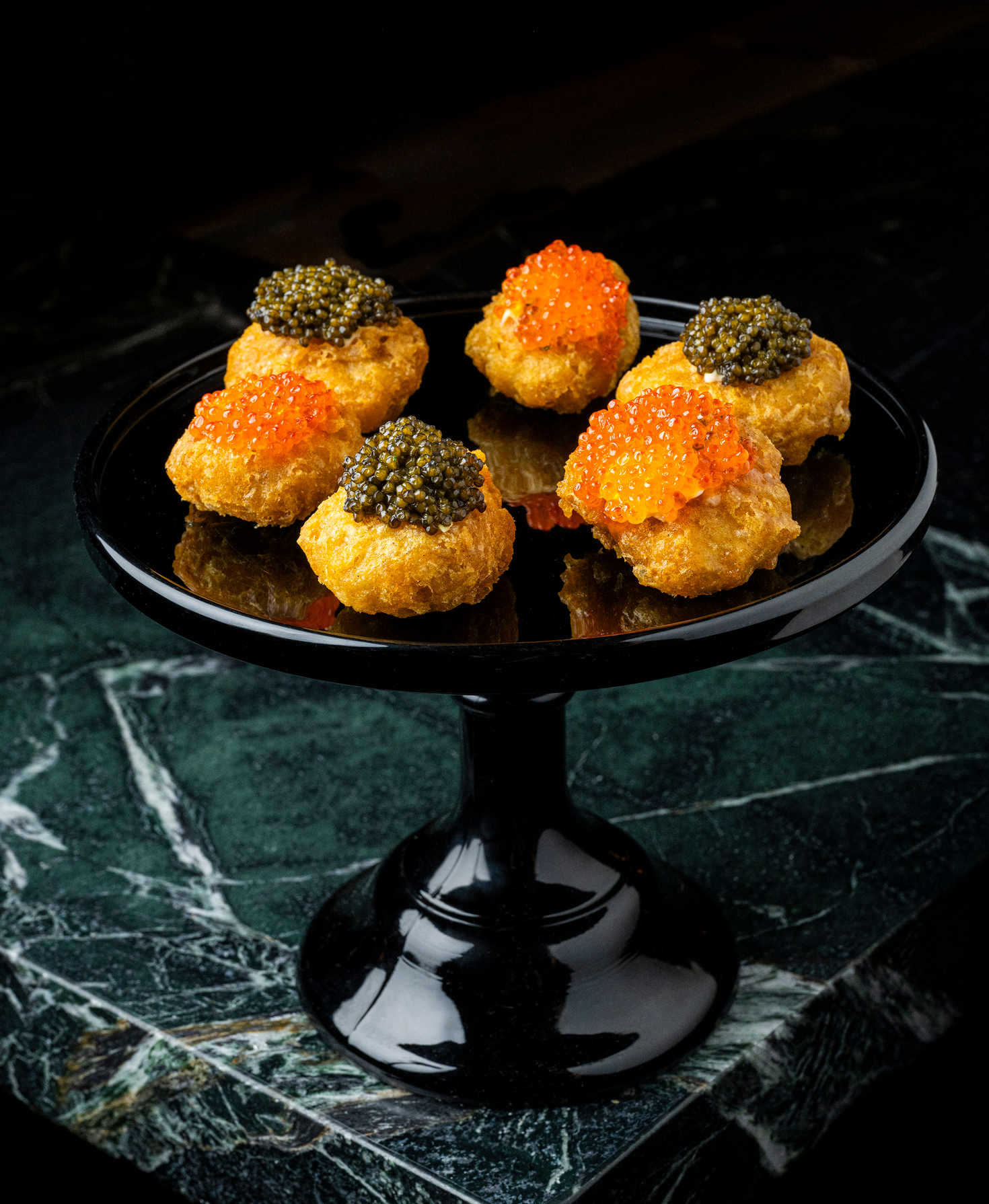Korean fried chicken rules the roost at Coqodaq, the New York restaurant from Simon Kim and Gracious Hospitality Management. The concept reimagines fried chicken as fine dining with an inventive, unapologetic menu that includes caviar-topped nuggets, clever “coqtails,” and the most extensive Champagne list in the US.