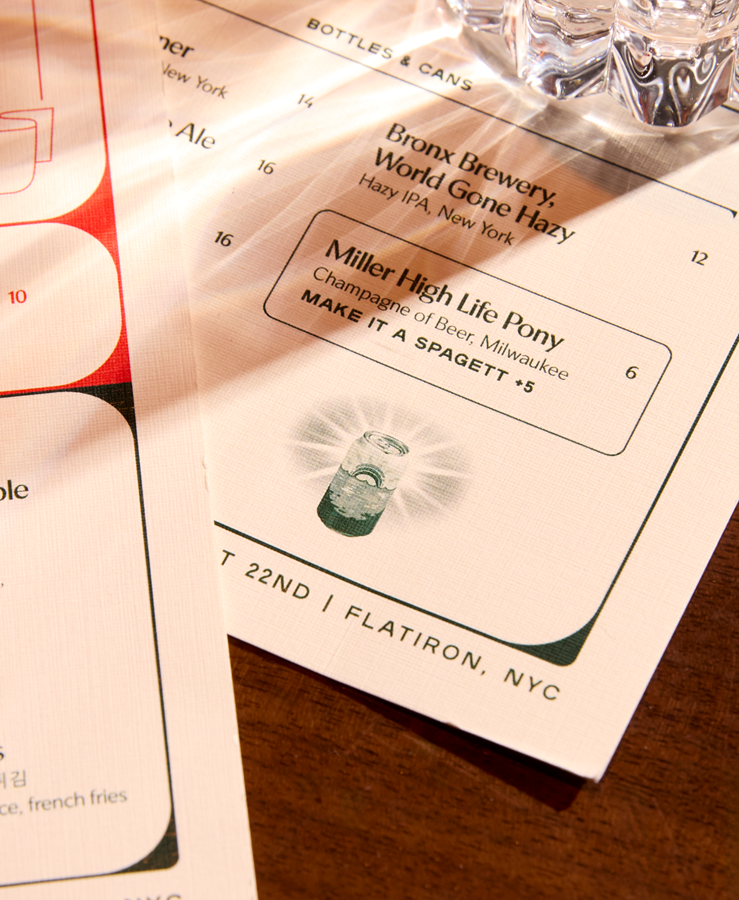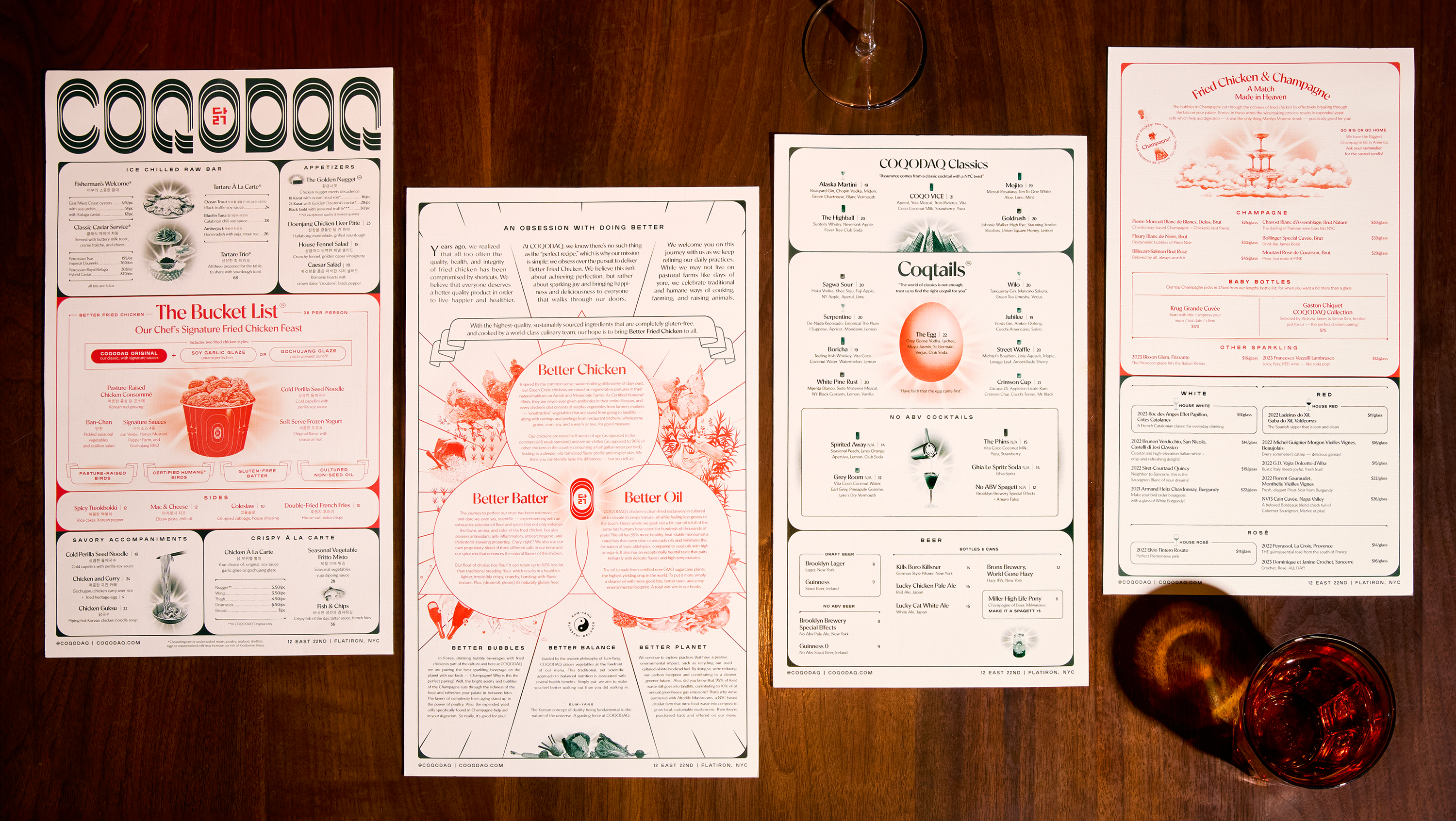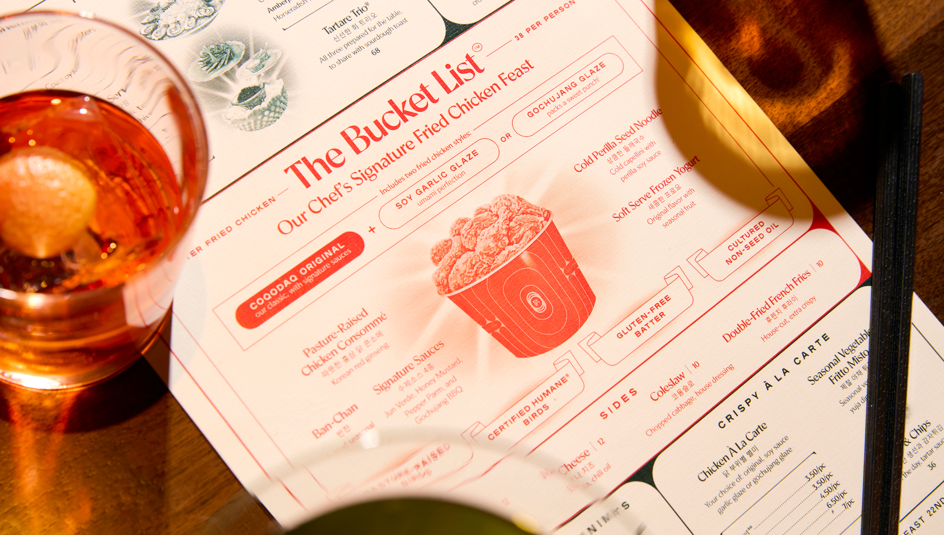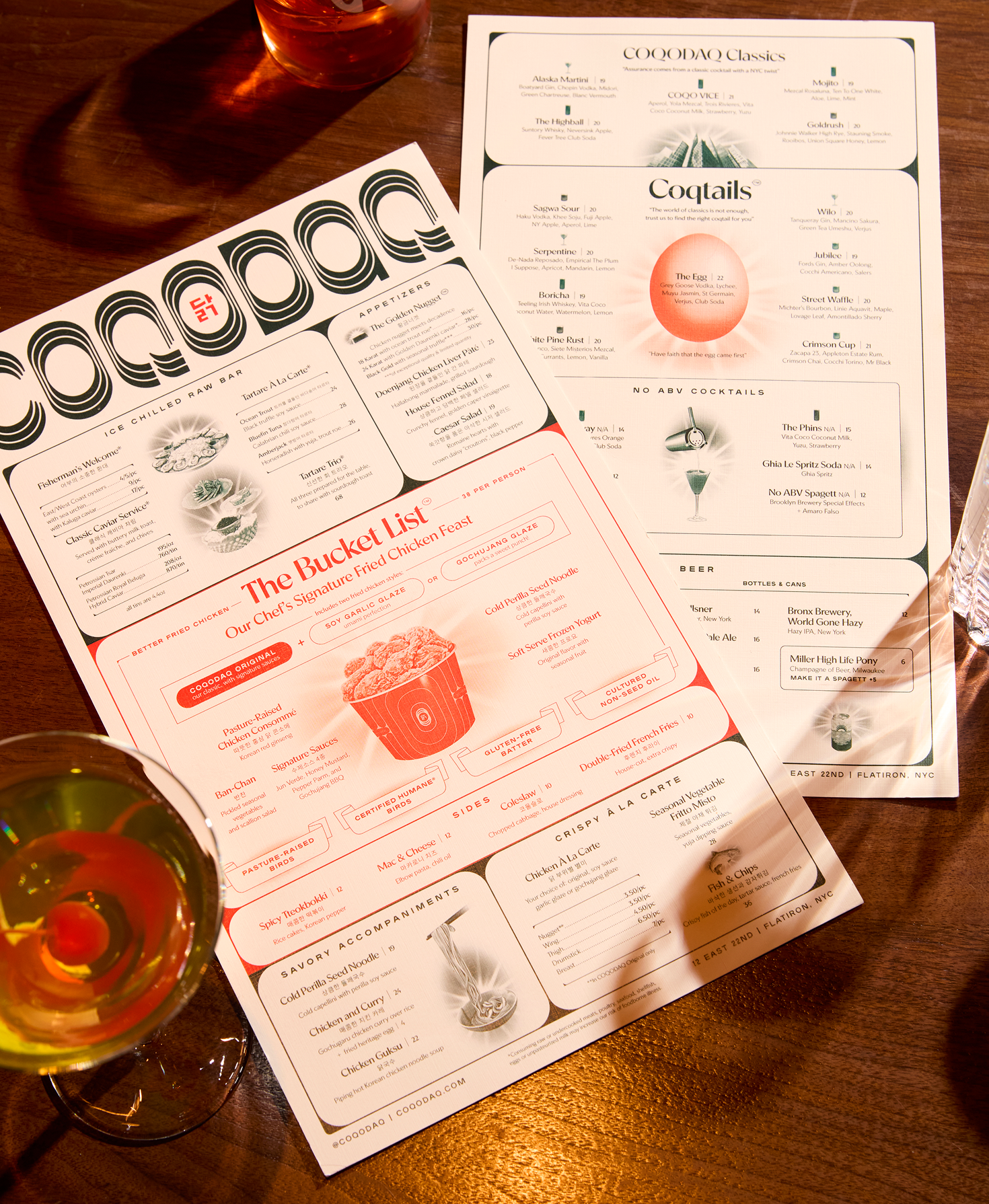 Coqodaq joins Oberman’s previous collaborations with Kim on the branding for Cote Korean Steakhouse, his Michelin-starred, James Beard-nominated restaurant with locations in New York, Miami, Las Vegas and Singapore. At Coqodaq, executive chef Seung Kyu Kim has perfected fried chicken that is exceptionally crispy yet remarkably light, guided by the menu’s stated trifecta of “better oil, better batter, better chicken.” Made with organic, carefully sourced ingredients, the result is delicious but healthful––and earned the restaurant a Michelin Bib Gourmand. The centerpiece is the “Bucket List” set menu (named by Pentagram), which pairs fried chicken with a choice of glazes, alongside banchan, cold perilla seed noodles and soft serve frozen yogurt.