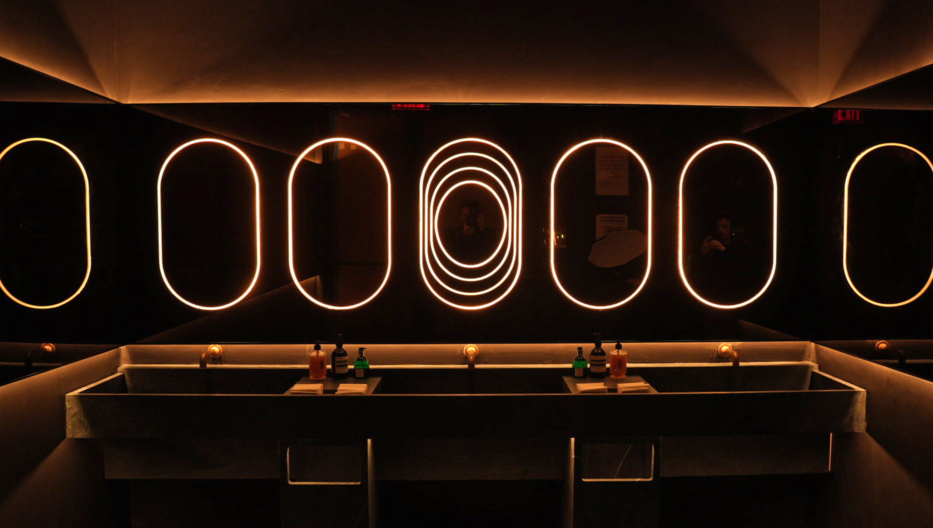The restaurant offers a range of experiences, from front-of-house high-tops and bar seating to plush banquettes in the rear. Monumental arches of illuminated cast glass run the length of the room like a cathedral nave, their depth amplified by an infinity mirror. Hidden at the very back is Go Go Sing, a secret karaoke room (with a new identity in the works). The ovoid shapes of the logo are echoed everywhere––from the bronze mirrors at the handwishing stations, to the sconces in the hallway that hold each letter of the logo, to the curve of the dining banquettes and the karaoke stage.