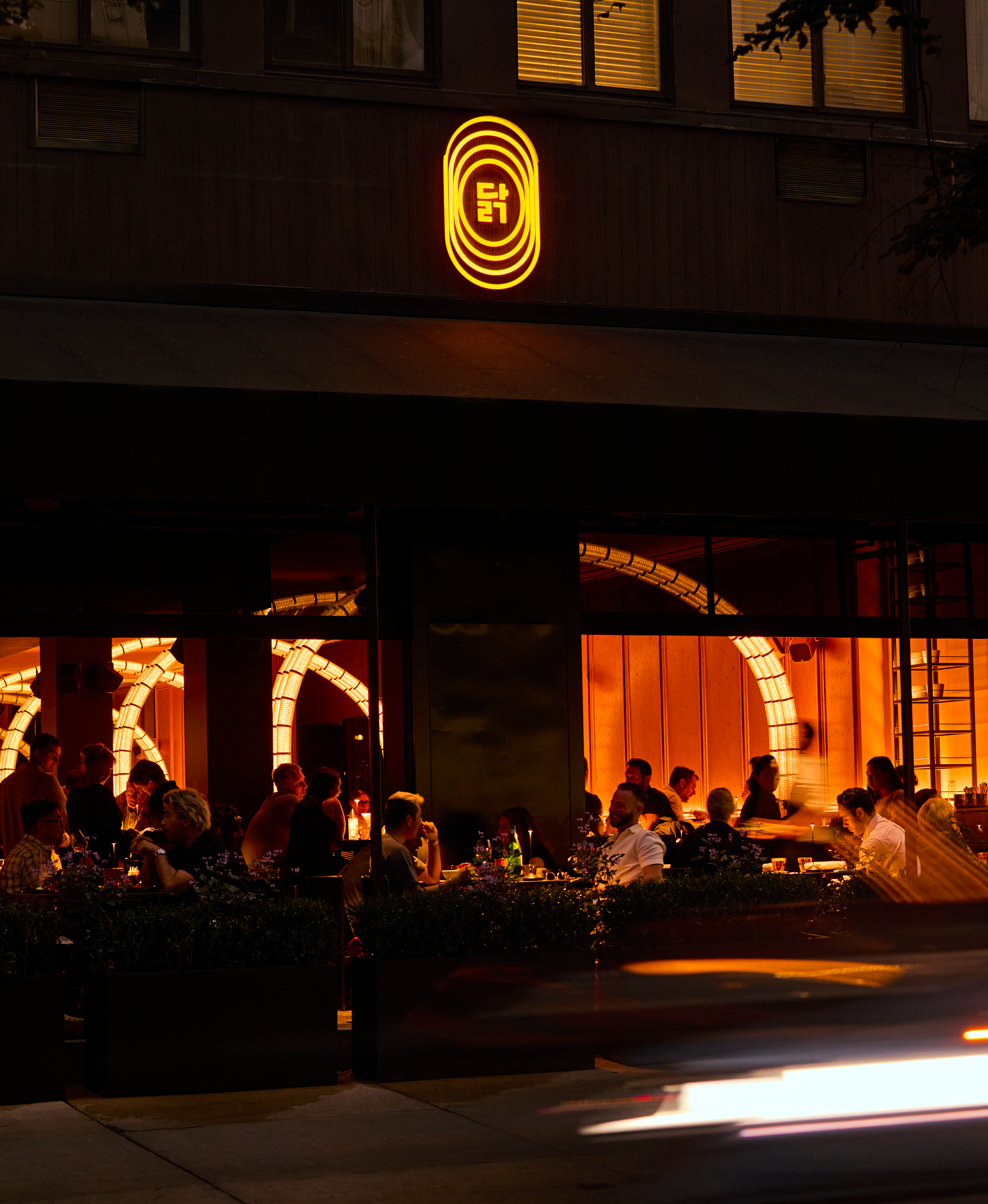 In Kim’s vision, Coqodaq is “a cathedral for all things chicken.” The brand identity is integrated throughout the interior design, inspiring its forms, shapes, and color palette to help create a fully immersive atmosphere. The luxurious dining room is sleek, dark and moody, with warm, dynamic lighting that creates an inviting glow.
