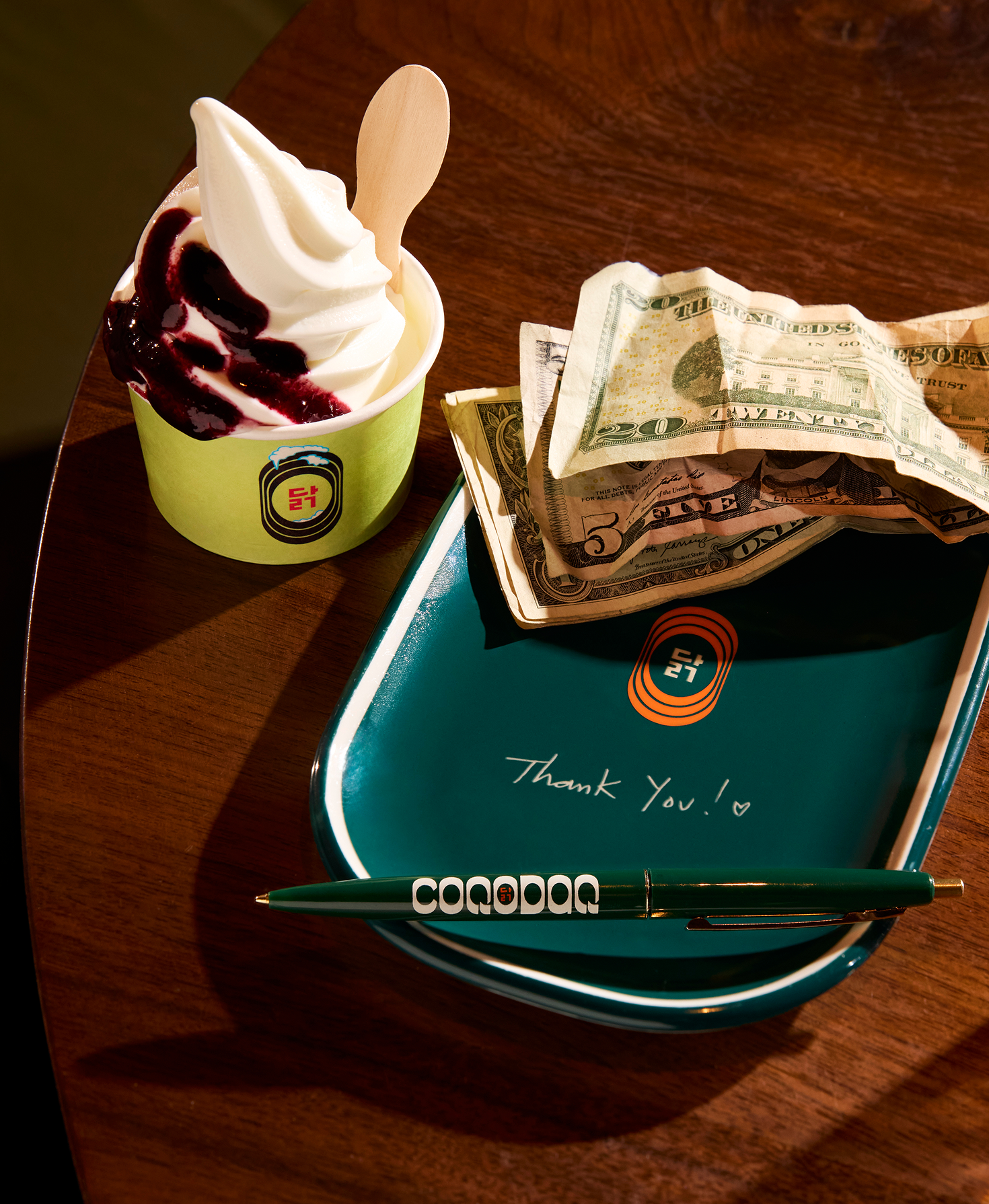 The logo’s “Easter eggs” extend throughout the experience, appearing in the menu, plateware and service as moments of surprise and delight. Details range from lapel pins denoting staff tiers to a stoneware chicken bucket engraved with the mark, and frozen-yogurt cups topped with a bit of frost. The printed and digital menus feature mouthwatering, hyper-realistic drawings by illustrator Han Dang––buckets of chicken and banchan side dishes rendered with an almost divine glow. This visual language carries through to teaser animations on social media, reinforcing the brand at every touchpoint.