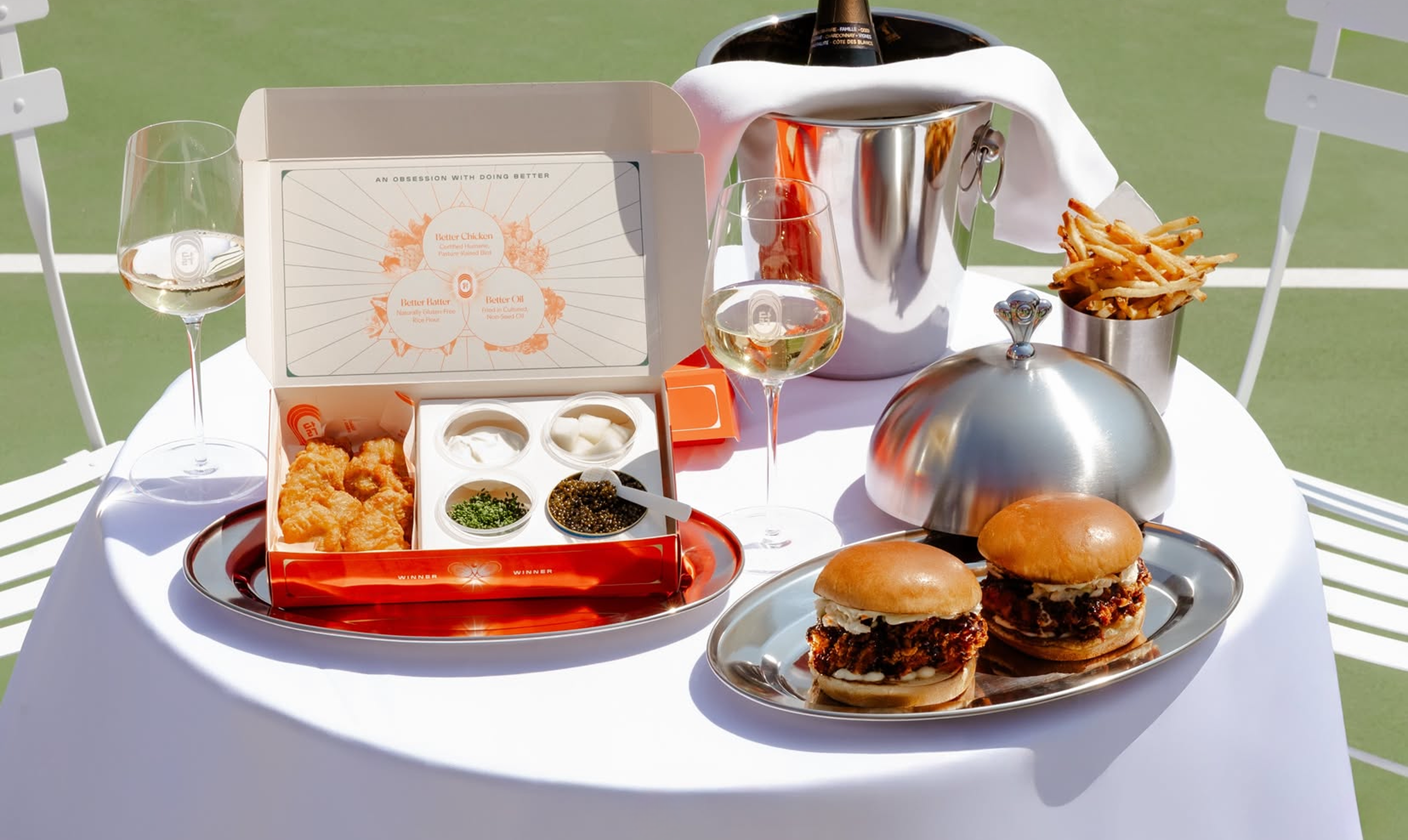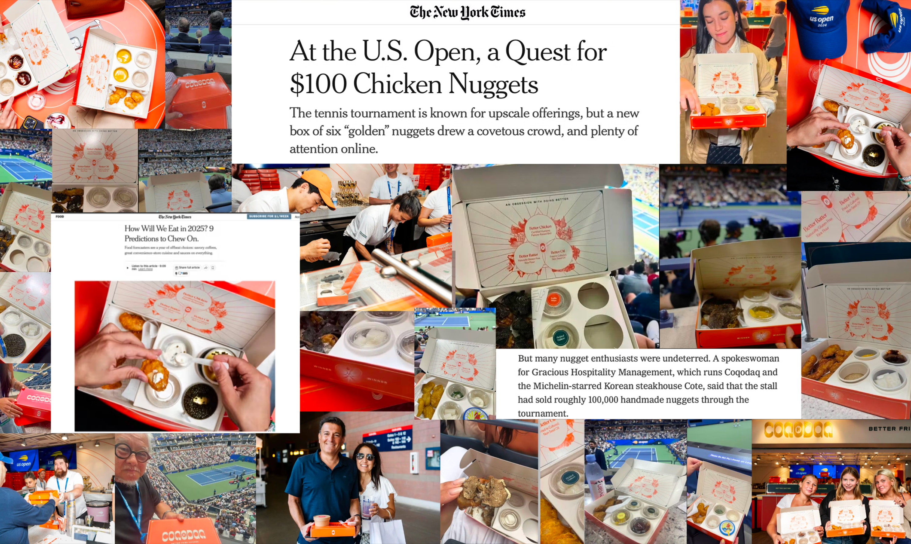 Building on the restaurant’s blockbuster success, Kim launched CQDQ––Coqodaq to go––including a headline-making pop-up at the US Open. Served in striking custom takeaway boxes, the “Golden Set” of caviar-topped chicken nuggets quickly went viral as a courtside favorite. Winner winner, chicken dinner!