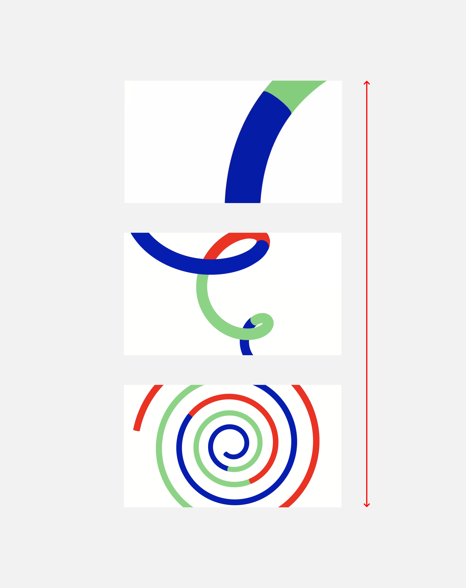 Paired with the spiral is a bar, the same idea linearised — the narrative thread, before it coils. Where the spiral carries the concept, the bars do the practical work of holding and framing content across layouts. With no hard stops, and the bar intentionally pressing off edges, the system implies continuation — everything is mid-story.