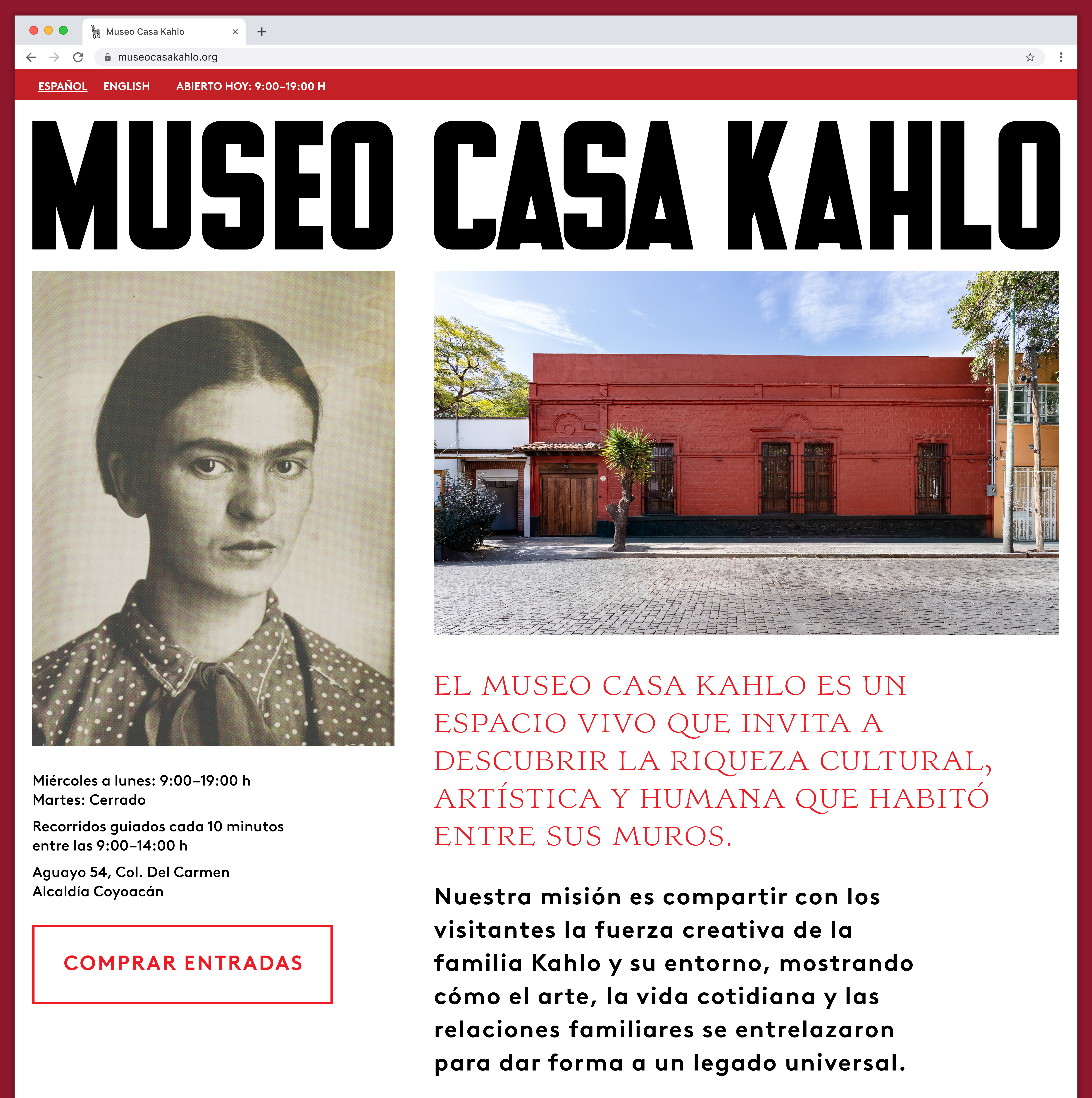 The visual identity is rooted in a spectrum of reds, lettering inspired by Mexican modernist typography, and a typeface based directly on Frida’s distinctive lettering.