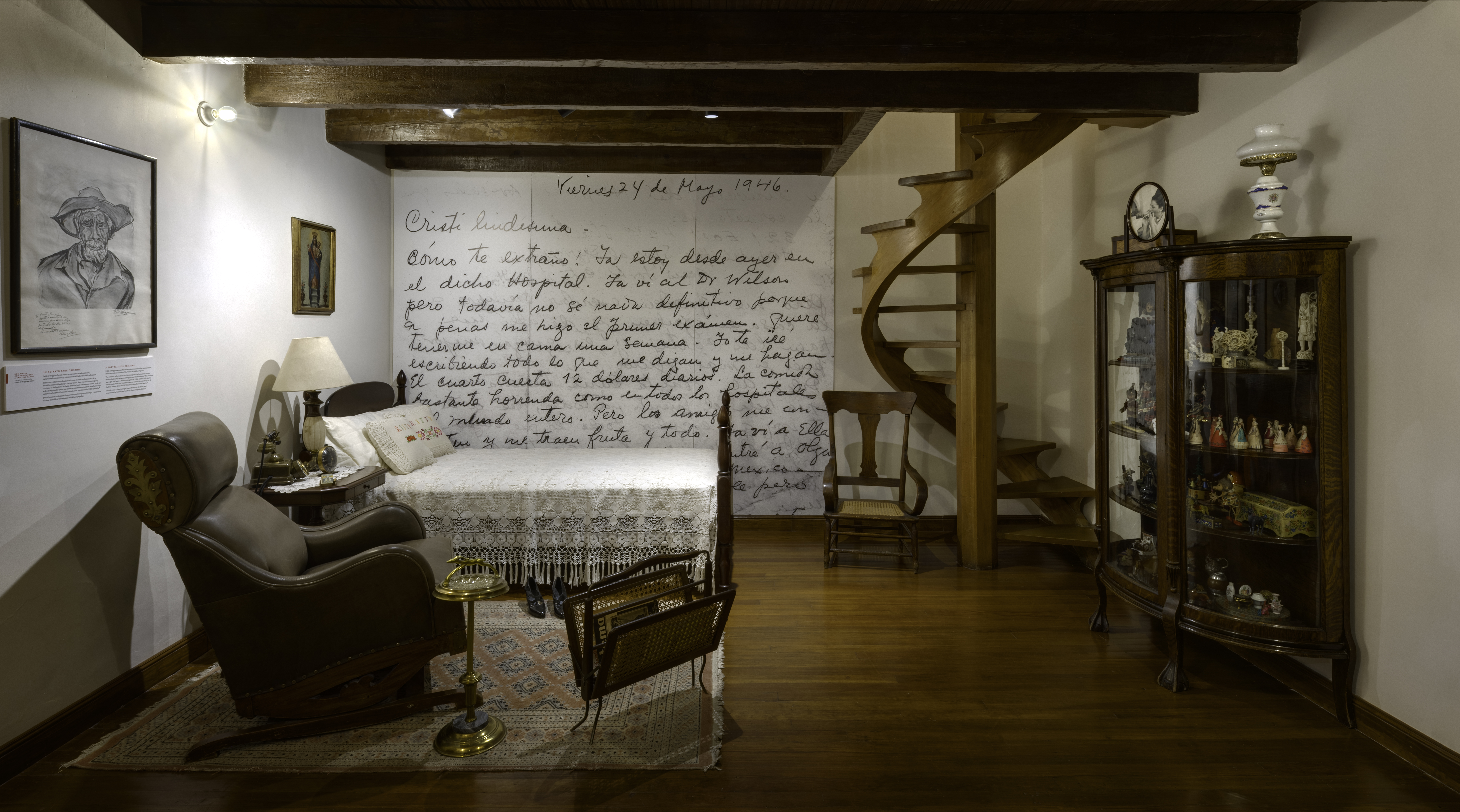 On view are Guillermo’s darkroom; the family kitchen—featuring the only mural Frida ever painted—the bathroom; and Cristina’s bedroom. Another gallery examines Frida’s distinctive sense of style, presenting traditional Mexican dress and jewelry from her collection. Additional displays explore her role as a teacher, with works by her pupils—known as Los Fridos—alongside drawings and archival footage of them painting a mural. The museum also recounts the story of La Ayuda (“The Help”), the nonprofit founded by Cristina to support single mothers in the neighborhood.