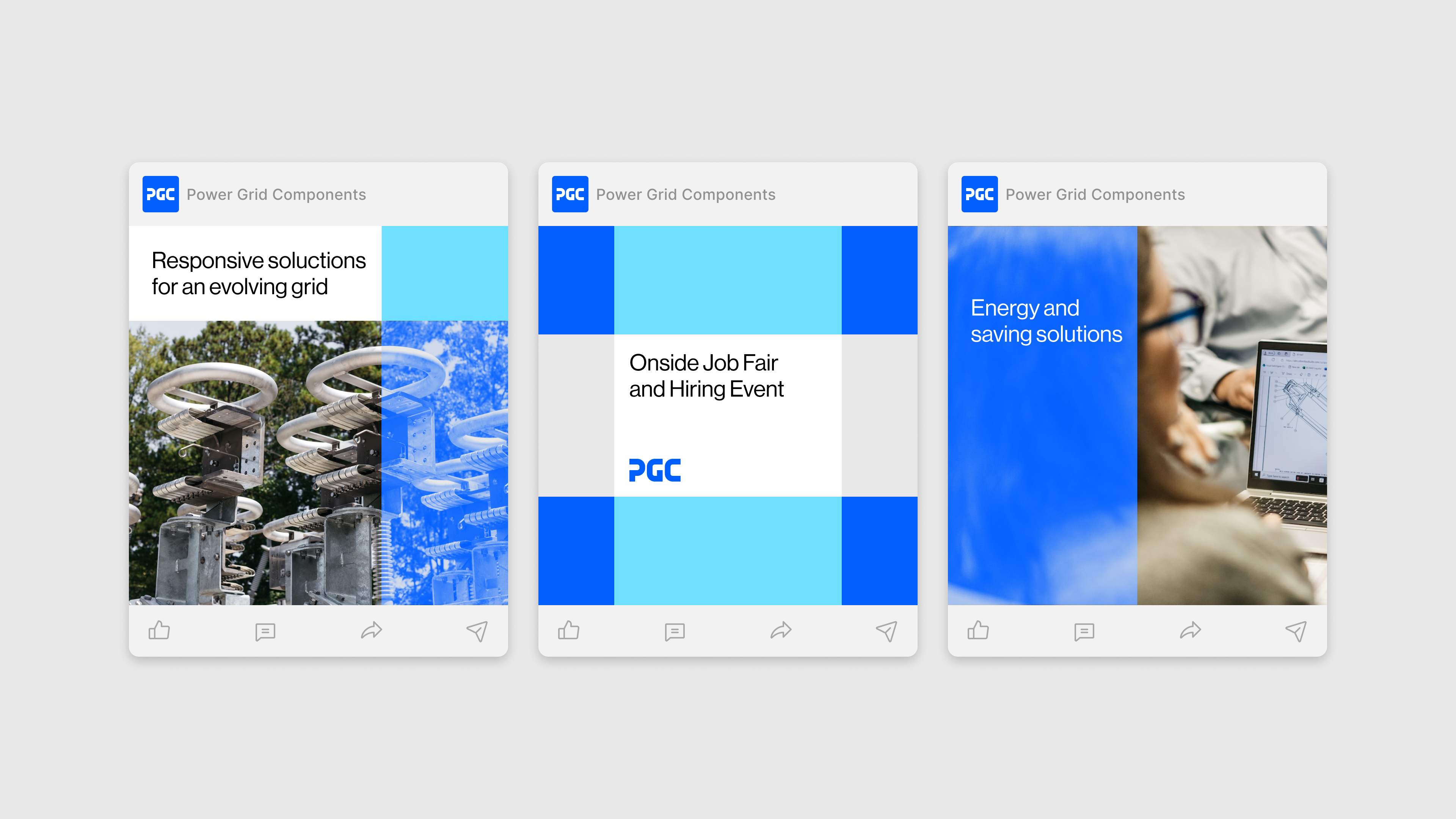 Across the portfolio, brand equity varied widely. The shortened name enables an endorsed brand architecture, positioning PGC as a strong parent while allowing the sub-brands to retain their individual identities. The designers refined existing logos where equity was strong, and fully redesigned others where greater alignment was needed. A shared electric blue carries across the sub-brands, signaling each company’s place within the PGC family.