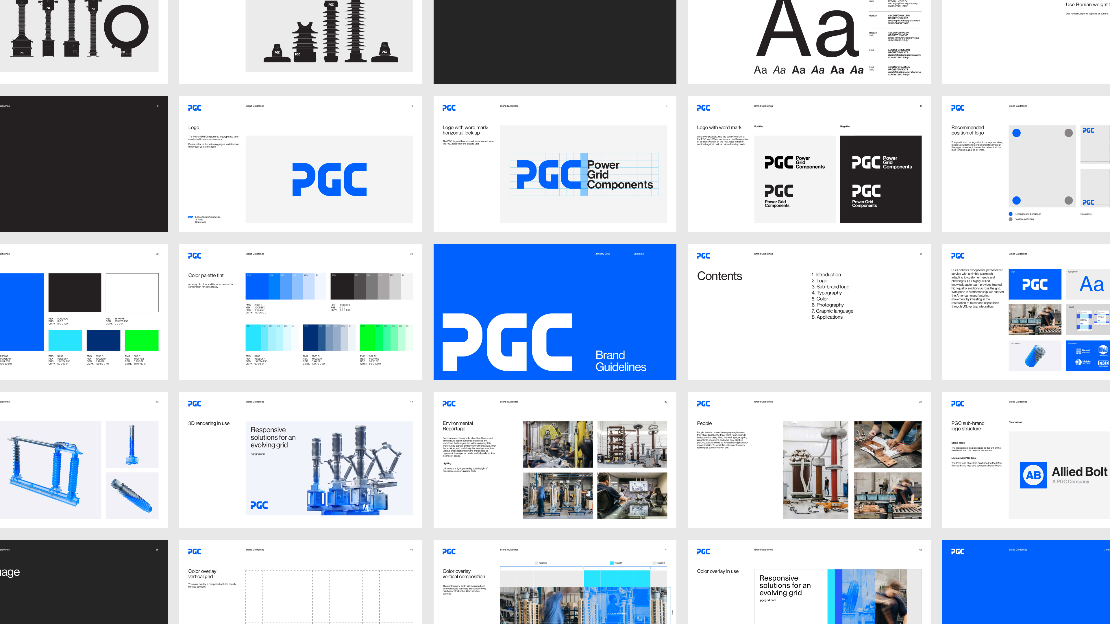 Power Grid Components (PGC) is a leading domestic designer and manufacturer of critical components for protection, monitoring, and safety in electrical substations, including transformers, insulators, protectors, and switches. As a trusted supplier to the North American power grid and a partner to many of the nation’s largest utilities, PGC supports the global energy transition by enhancing grid reliability, capacity, and safety. Pentagram’s new identity establishes a powerful presence for PGC, emphasizing its role as a maker of the critical components that keep the world running.